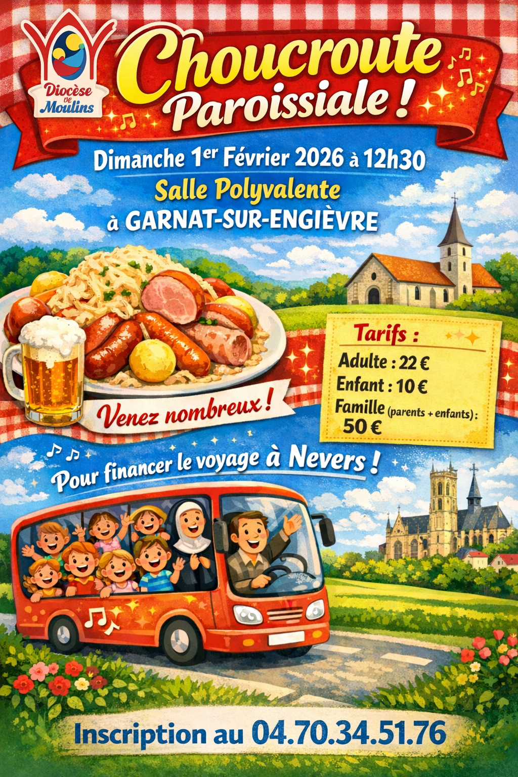 Dimanche 1er février, après la messe à Diou, nous sommes 80 à avoir rejoint la salle polyvalente de Garnat-sur-Engièvre pour la traditionnelle CHOUCROUTE PAROISSIALE.