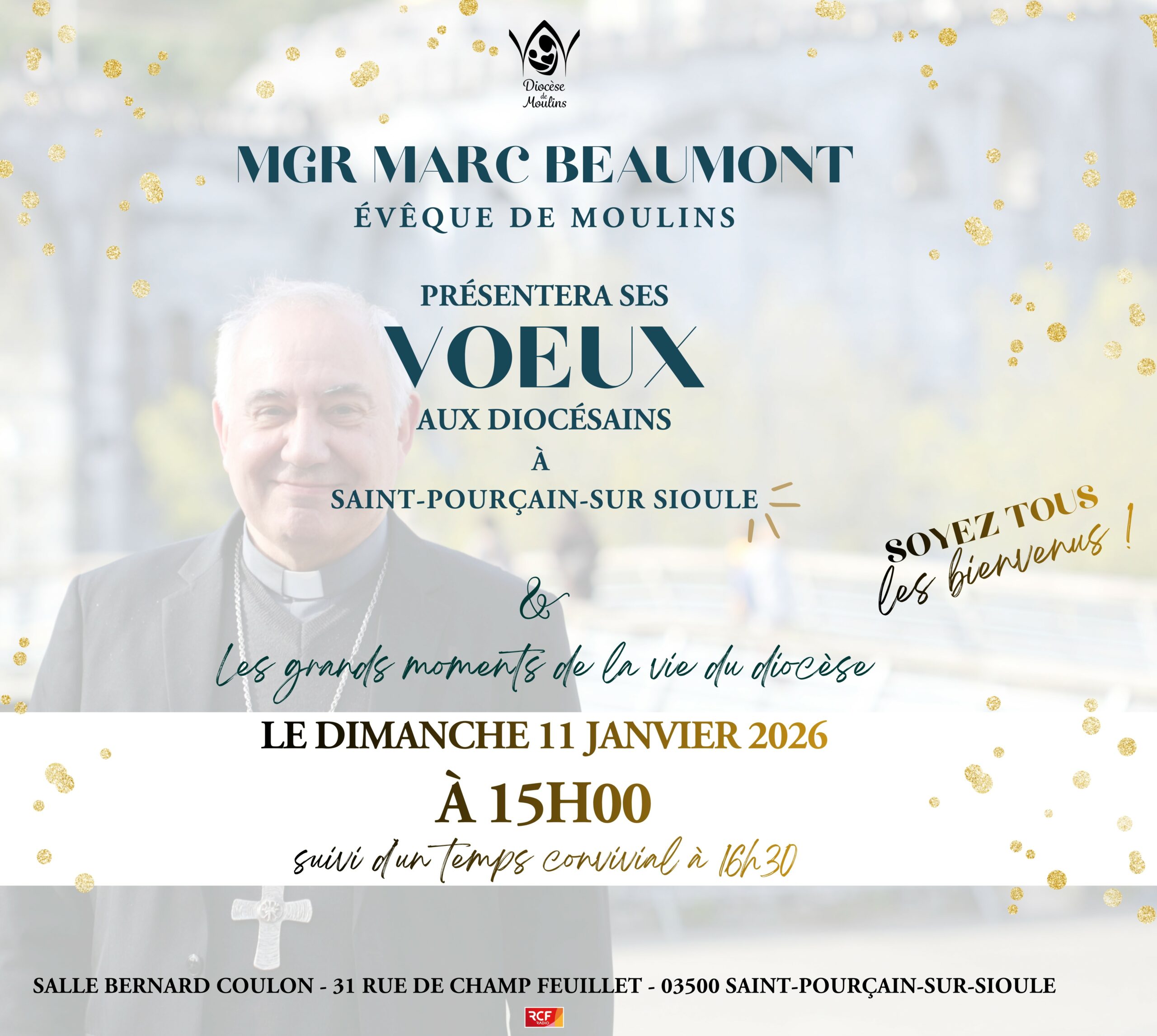 Le dimanche 11 janvier à 15h : Saint Pourçain-sur-Sioule Salle Bernard Coulon, 31 rue du champ Feuillet. Notre évêque, Mgr Marc Beaumont présentera ses vœux aux diocésains. Vers 16h30 un temps de convivialité permettra de partager sur notre vécu et nos projets pour 2026. Venons nombreux, c'est un moment important...Lire la suite
